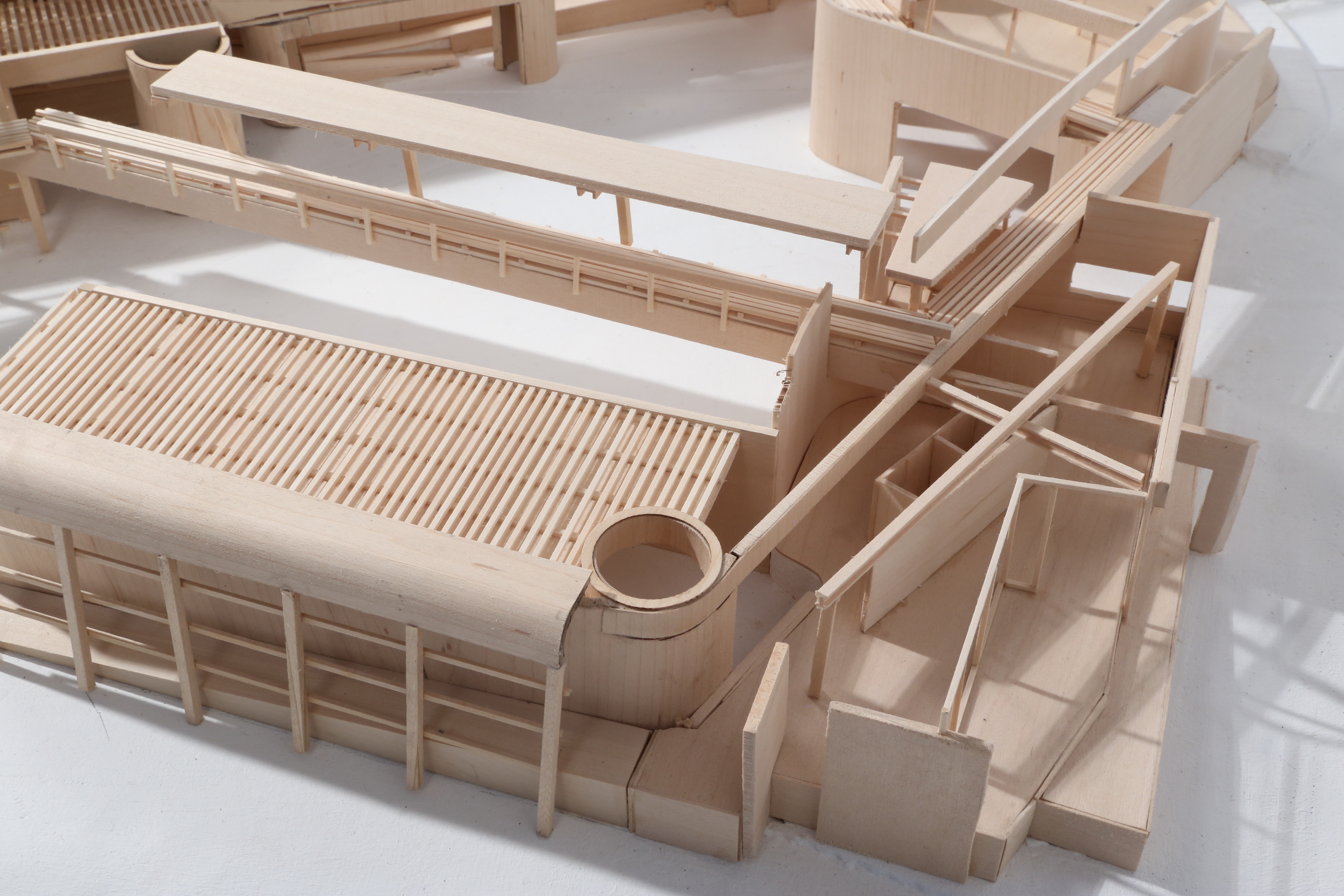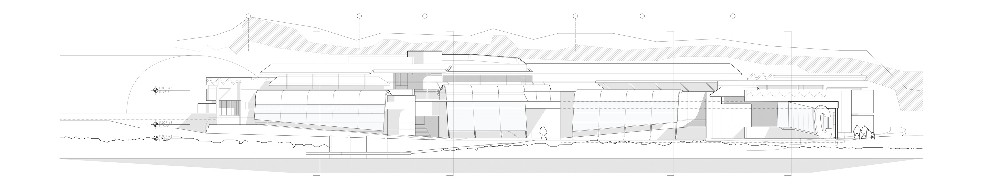 The Rowing Complex for Columbia University is conceived of as an expanded choreography of the act of rowing. Situated in an inlet from the Hudson river, the building acts as a staging area for rowers to maintain and prepare racing shells, as well as a place for students to exercise and study. The composition of the building is conceived of as a consistent sectional drawing which is oriented along a line which moves throughout the site. The sectional condition defines the relationship between boat storage and all other programs. In this sense, the building is divided into discreet chunks which share overlapping roofs and circulation corridors.
