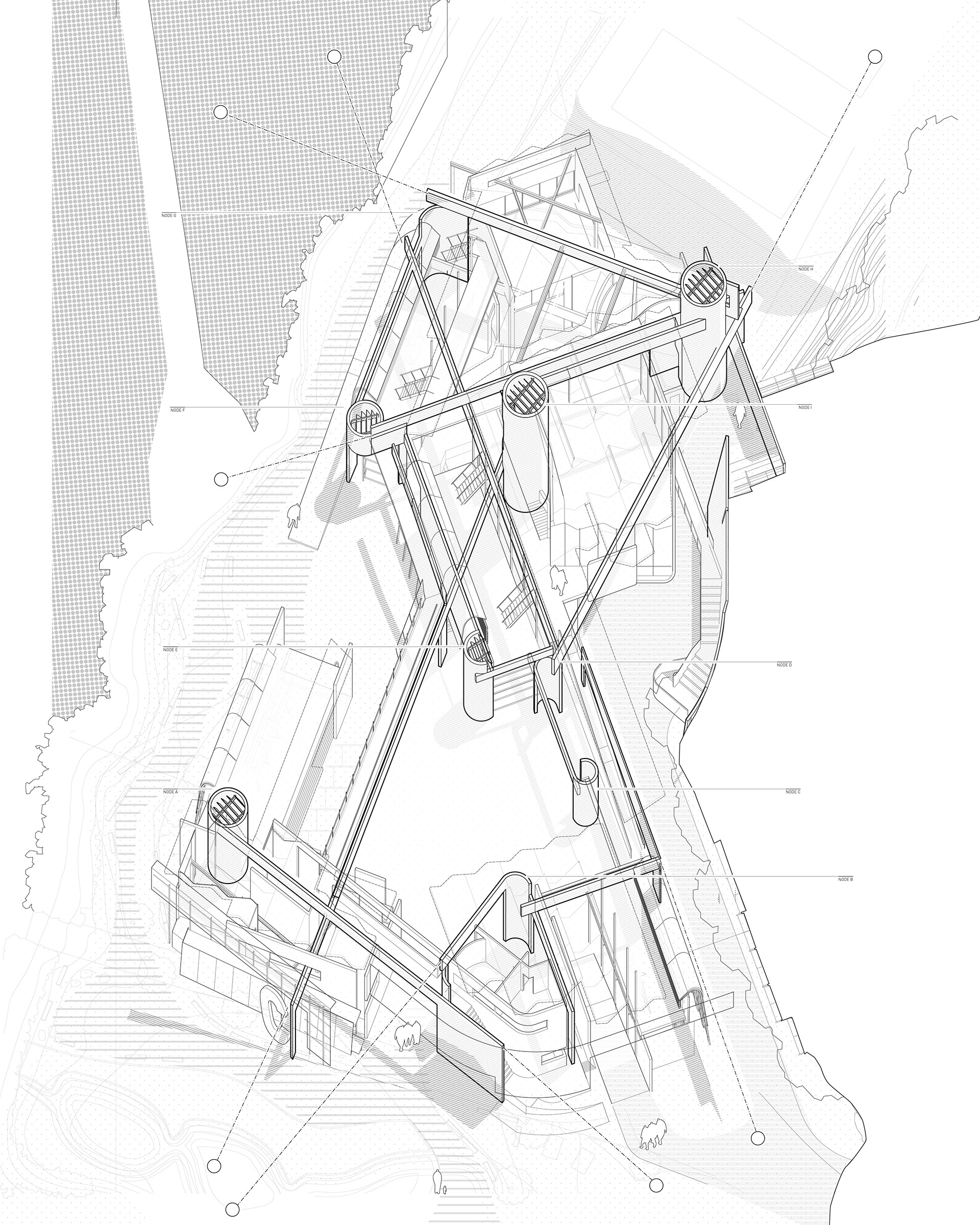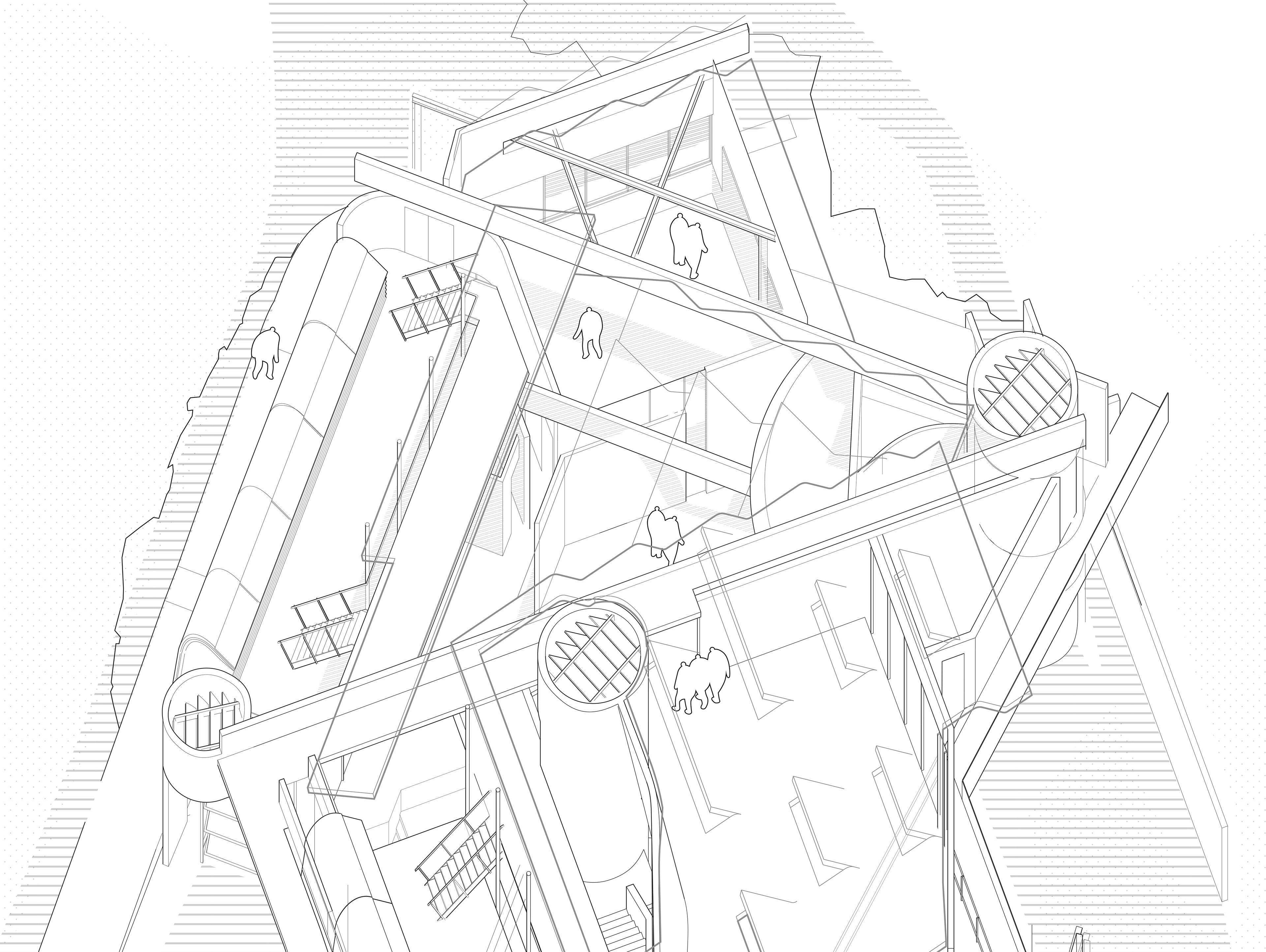 Columbia University has decided to upgrade and modernize its boathouse facility on the Harlem River adjacent to Baker Field sports complex. Program is influenced by the choreography of boat movement. Building mass is swept throughout the site leaving a volume/void relationship influenced by the acts of retrieval, launch, and ultimate storage of the boats. Two-dimensional analytic information is superimposed and negotiated. Program is imagined as sequence, rather than volumetric spaces. This datum is comprised of different forces acting and reacting to the site. This creates a stratified layering of information from which to negotiate. The form was generated was through a process of reinterpreting the superimposed 2D information with the idea being that each cell of boat storage becomes a microcosm of the entire boathouse program.