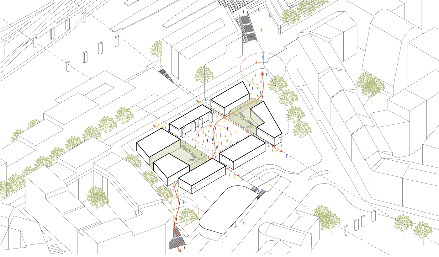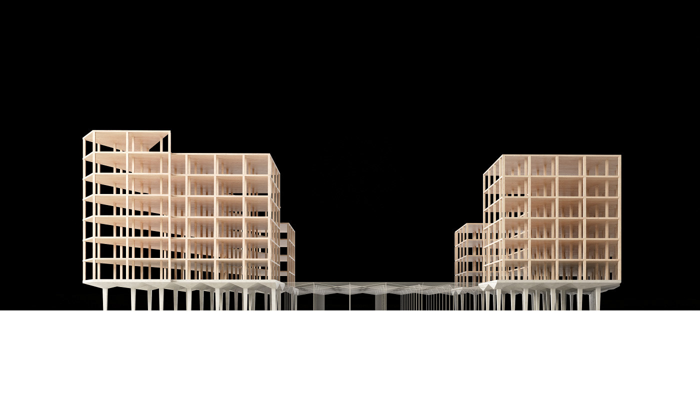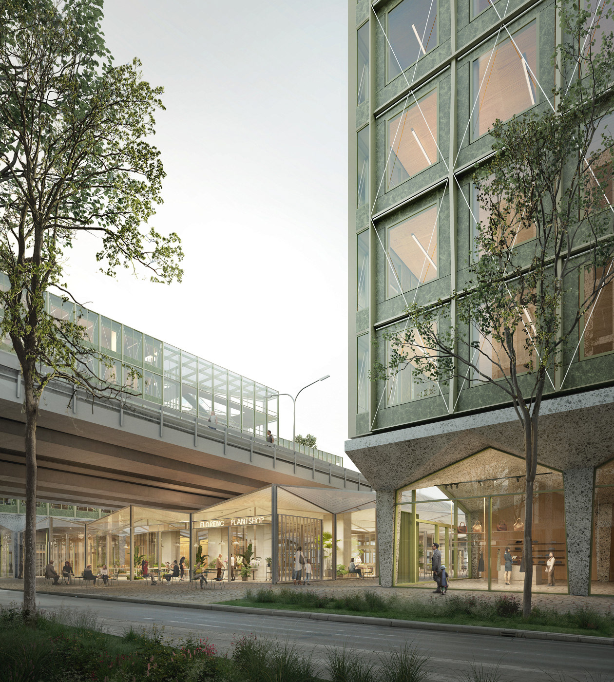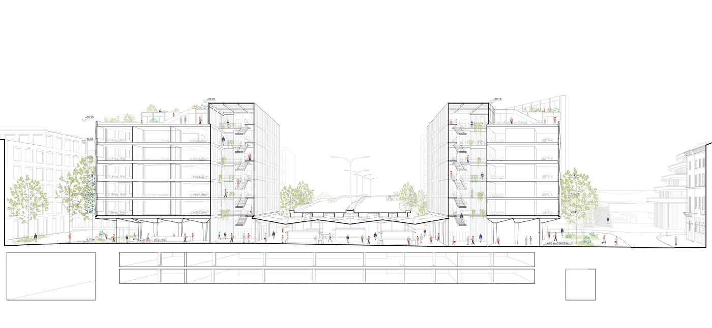 The design establishes a cohesive and distinctive architectural identity that is deeply rooted in Prague’s cultural and architectural identity, while integrating the block seamlessly into its context. The organization enable path/ throughways permeably that will help connect it to the neighbourhood. The block is compact and divided by the flyover highway into two volumes that are in visual and geometric dialogue, unified by a continuous, spatially open ground floor – a canopy-covered urban market (shops, cafes, lobbies and entrances) that grounds the entire ensemble and links it to the street. With their stepped profiles, the two buildings respond to the surrounding city heights, capped by a small-scale green roofscapes. Façade typologies were developed in response to Prague’s historic cityscape to further embed it into context.