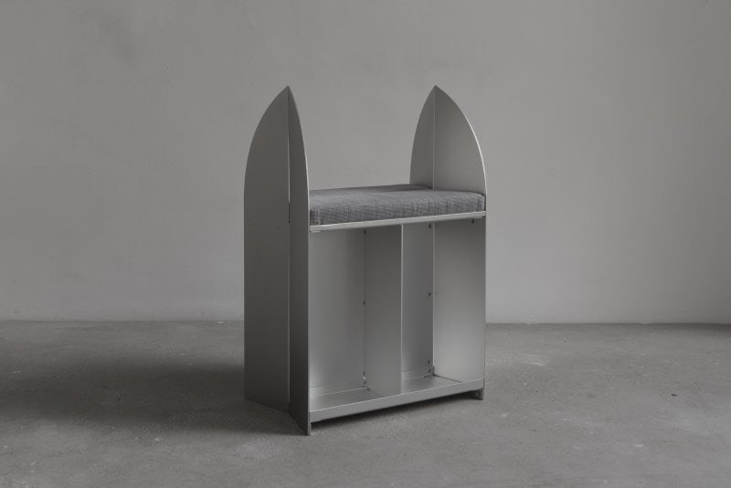 Aluminum stool for an organ player. In this stool, there's a kind of atavism—something medieval. It stands in opposition to the modern material and methods of manufacturing. We enjoy this slippage, this contradiction.