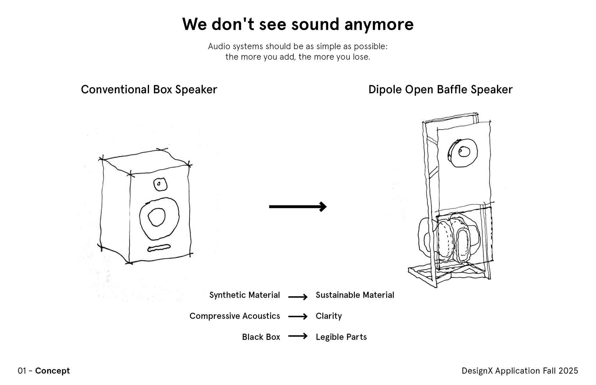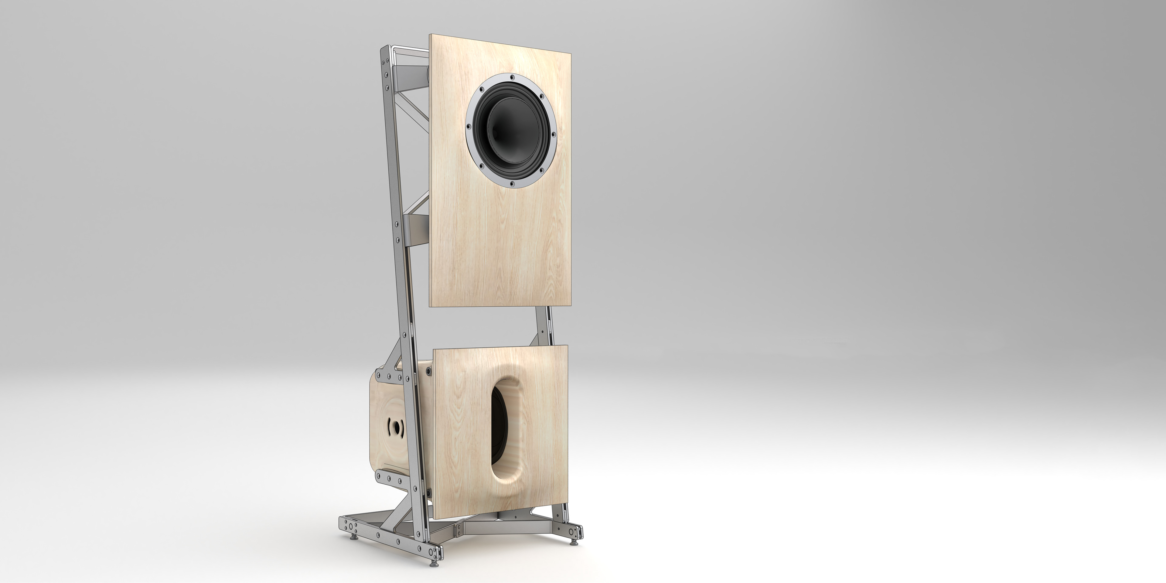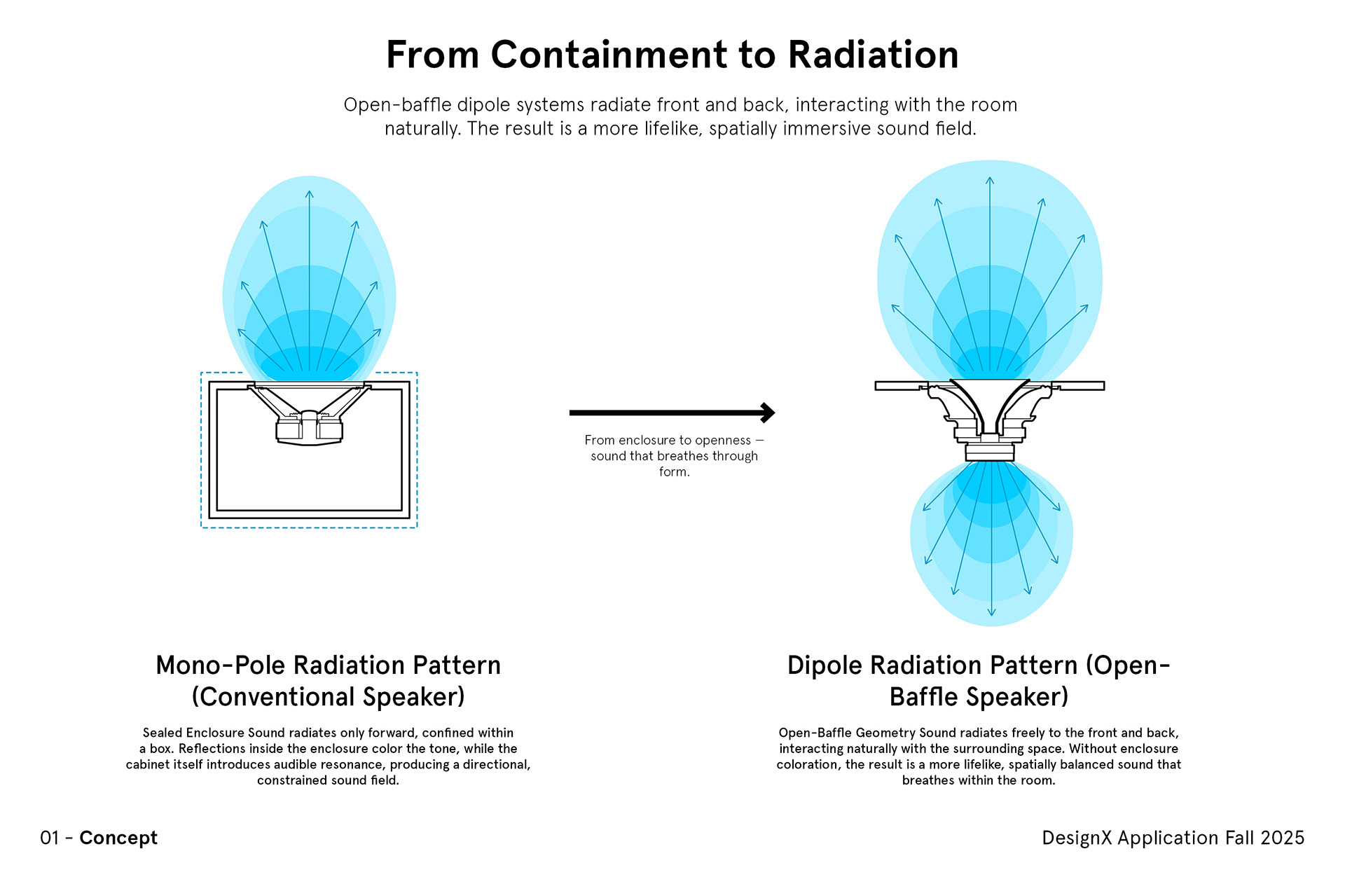 Our open-baffle speaker system, crafted for a novel auditory and aesthetic experience, transforms its space into a dynamic part of the sound itself. Unlike traditional enclosed speakers, this system radiates sound in a figure-eight pattern, sending waves both forward and backward and making the room an integral part of the acoustics.